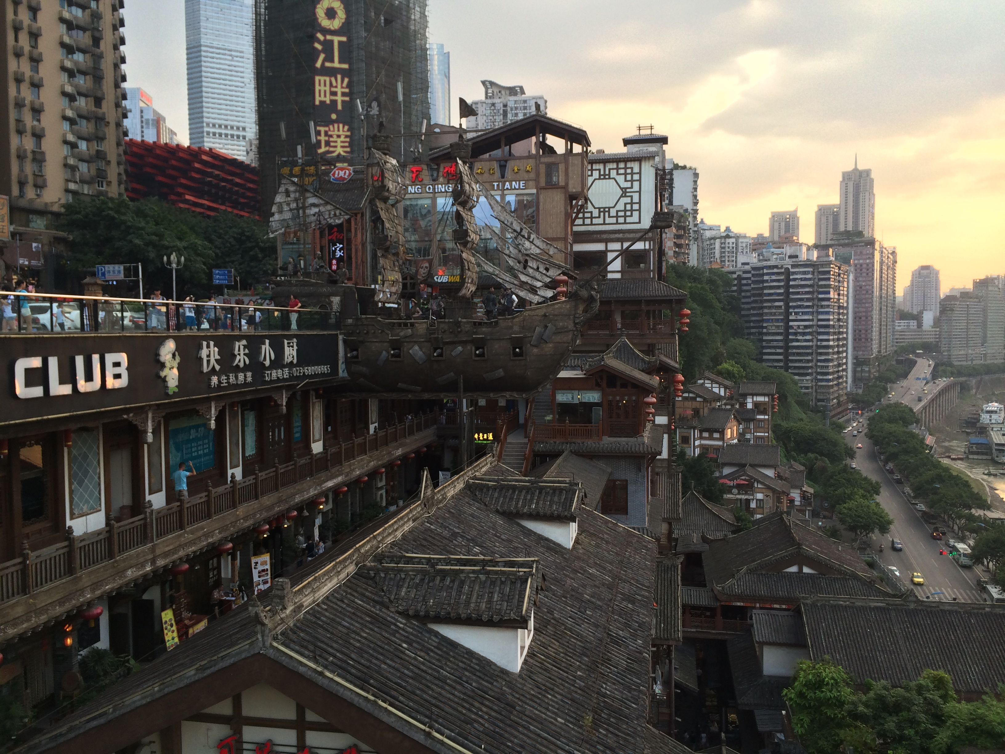- 要感受山势,我们发现洪崖洞这个地方很不错。两条平行的,距离不超过100米的路,高度相差11层楼。站在栏杆边沿着路的方向看,感觉十分明显。