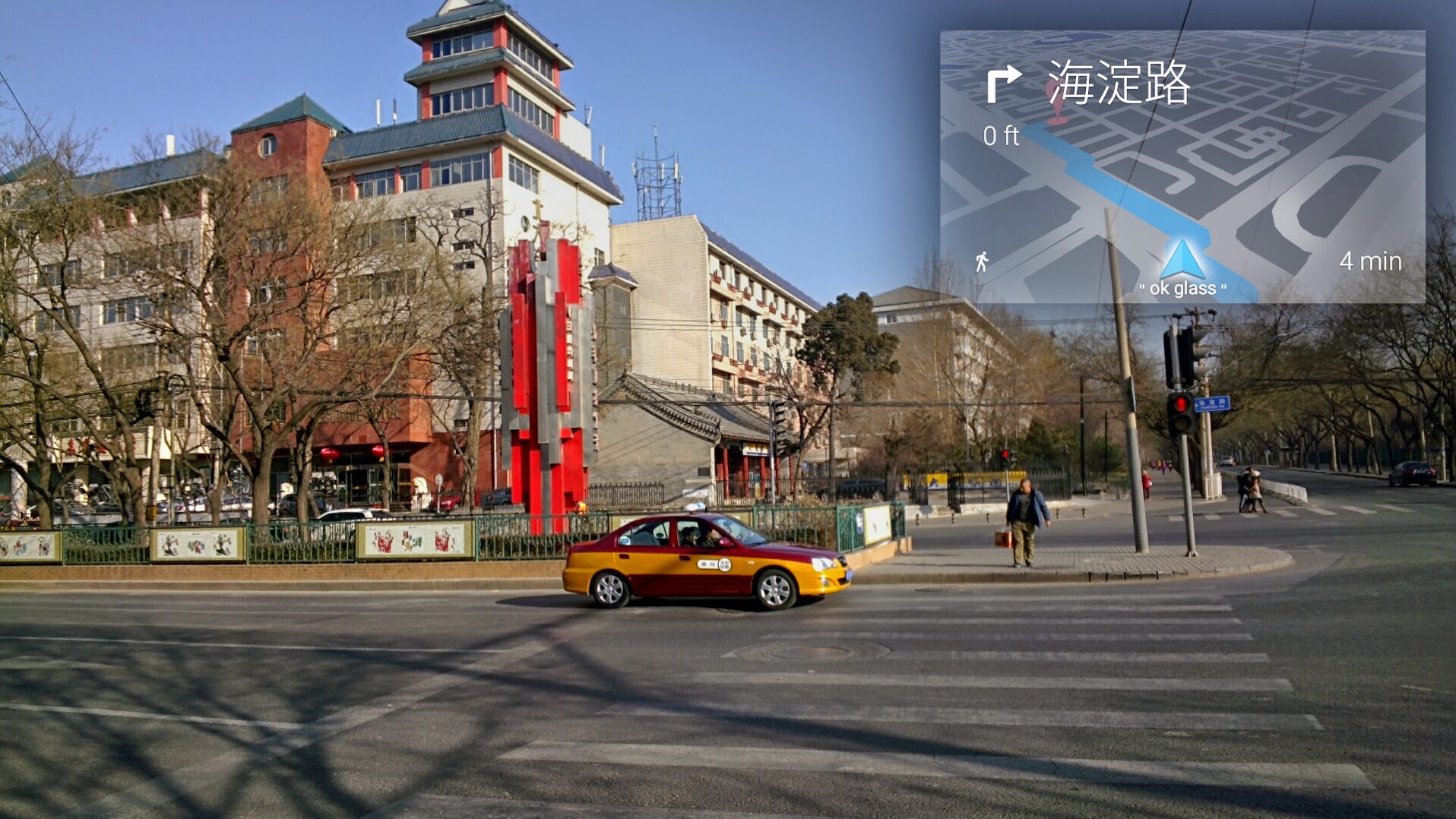 导航的效果比较科幻,视野右上角有一张地图,是俯视视角的。导航支持驾车、公共交通、步行。不过一直没啥机会用,只有在学校边上买东西的时候玩过。在导航中可以通过ok glass语音控制,显示完整路线、退出导航之类的功能。