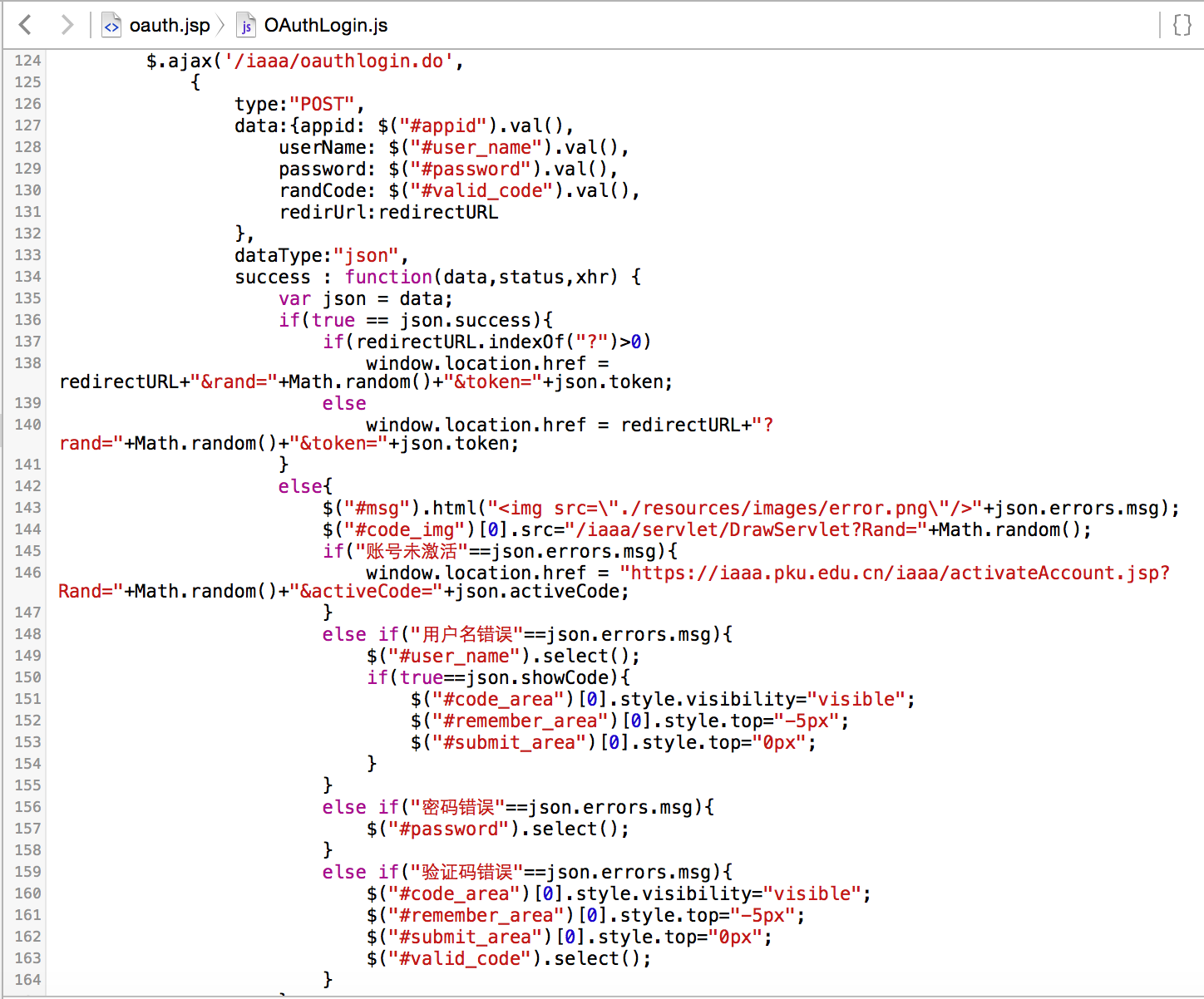 看上去是一个 OAuth 认证,用了 AJAX 框架,不过这两个点我都不了解具体细节。不过要看懂 JavaScript 代码很容易。这应该是一个 HTTP POST 报文,传输的内容有 appid, userName, password, randCode, redirUrl。根据上下文稍加理解,可以发现 randCode 就是验证码,而其他字段基本上就是本意。下面要做的就是确定 appid、redirURL 的内容。
